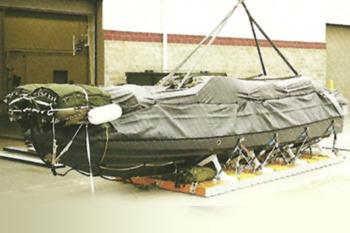 Airborne Systems specialises in providing a wide range of platform configurations for an extensive number of applications. The Airborne Systems PRIBAD and PURIBAD systems enable Rigid Inflatable Boats to be parachute dropped into the water, ready for immediate use. An extractor parachute pulls the load from the aircraft. The boat and platform separate immediately after leaving the aircraft and both descend to the water under their own parachutes.